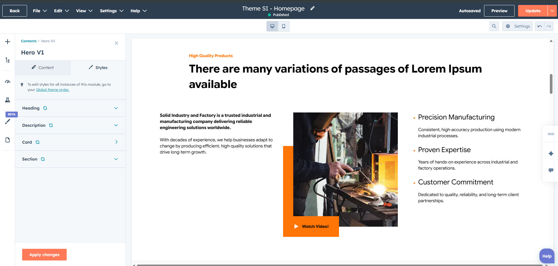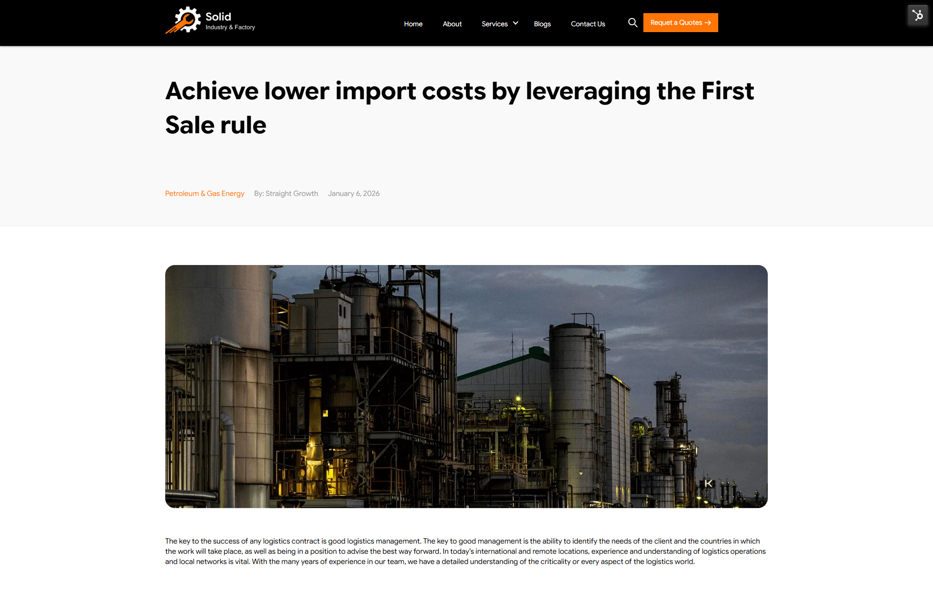 Solid Industries is a modern, performance‑focused HubSpot CMS theme designed for industrial, manufacturing, construction, engineering, logistics, and B2B service companies. The theme emphasizes strong visual hierarchy, bold typography, modular sections, and conversion‑driven layouts suitable for corporate and industrial websites.