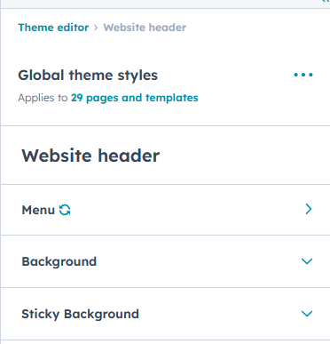 The Website Header settings allow you to customize the global header and navigation menu, including: